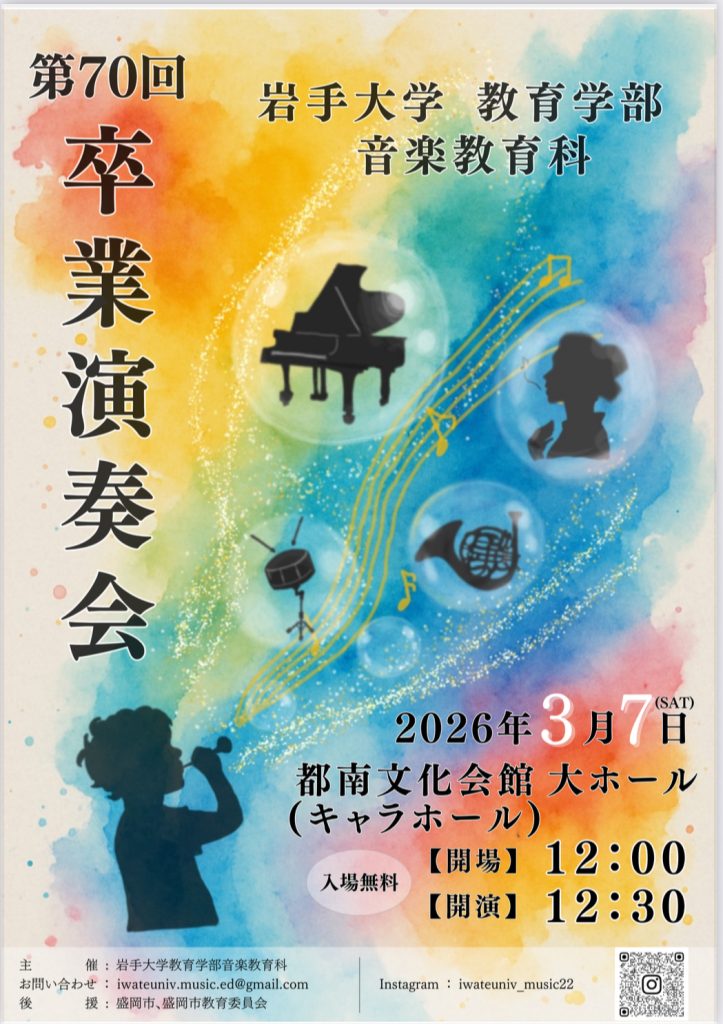 今年も岩手大学教育学部音楽教育科の4年生が卒業研究の成果を披露する時期がやってきました。私が大学に着任した年に入学し、そして担任を務めてきた学生の有終の美を見届けることが楽しみであり、出会った頃の記憶と現在の目を見張るほど成長した姿が重なると、とても感慨深く、そしてちょっと寂しさも感じる今日この頃です。残りの音楽科生活を思いっきり謳歌してください!学生達が作り上げる卒業演奏会が素晴らしいものになりますように。学生達のこれまでの積み重ねが芸術作品を通して昇華し放たれ、是非一人でも多くの方々の心に届きますように。そんな学生達の姿を会場で見守っていただければ幸いです。